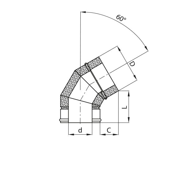 Element izolowany stosowany w celu zmiany kierunku przepływu spalin przy przyłączu kotła. Kąt 60 st.