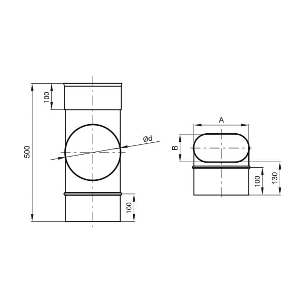 Element z wyjściem okrągłym 87° na szerszej ściance, służący do podłączenia czopucha z pionowym odcinkiem wkładu kominowego.